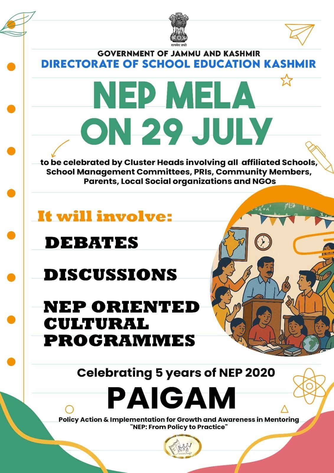 Srinagar, July 28 — As India marks five years of the transformative National Education Policy (NEP) 2020, Jammu and Kashmir is all set to host a vibrant celebration — #NEPMela — on July 29, bringing together students, educators, policymakers, and cultural voices under one roof.
