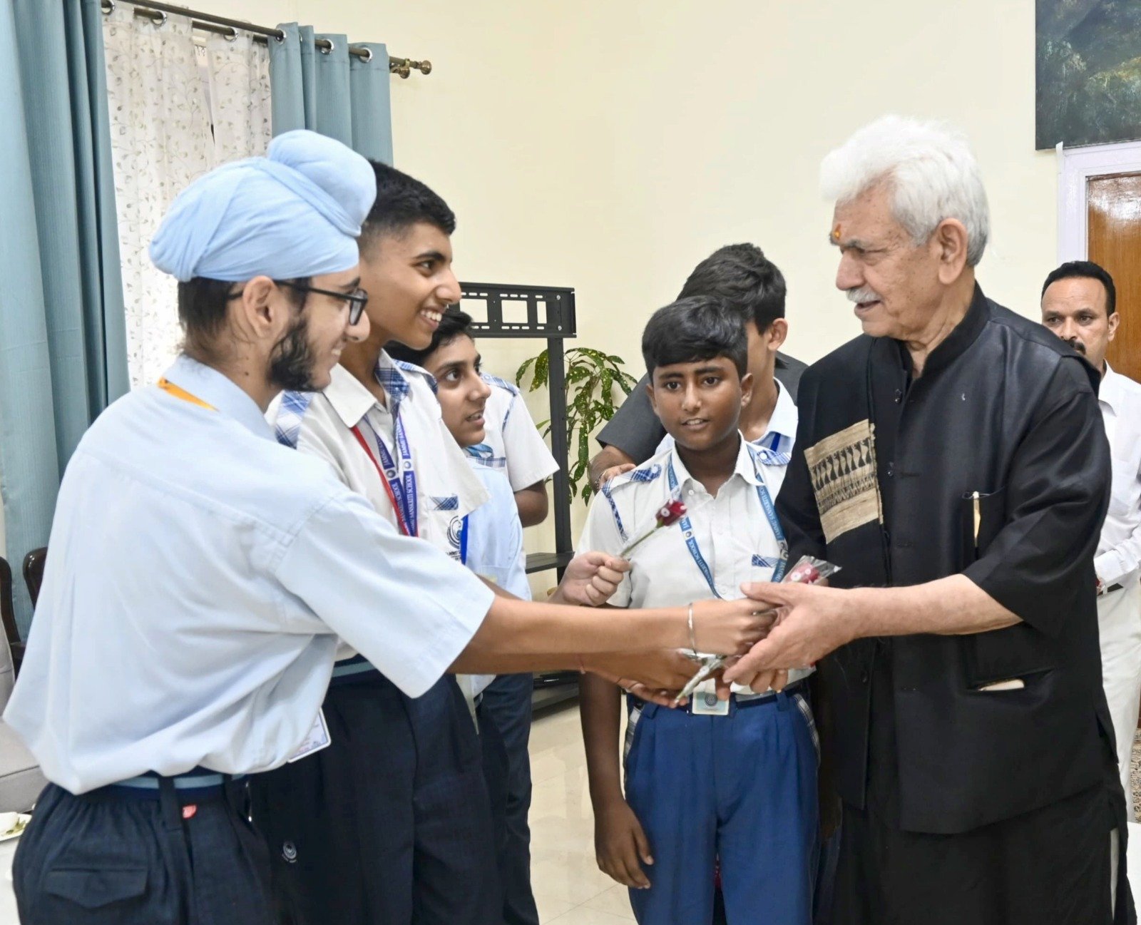 Jammu, July 20, 2025: Lieutenant Governor Manoj Sinha met with Children With Special Needs (CWSN) from Jammu Sanskriti School at Raj Bhawan, commending their outstanding achievements in the Special Olympics Bharat’s National Unified Sports Meet held at IIT Gandhinagar, Gujarat. The students, including Jasjeet, Mannan, Mridul, Anand, Uttman, Varaspreet, Praful, and Sparsh Sharma, excelled in sports disciplines such as volleyball and badminton, showcasing remarkable talent and determination.