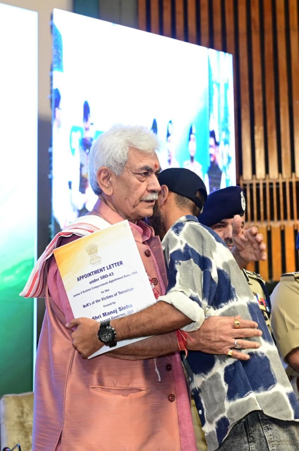 The LG narrated several tragic incidents, including the case of Abdul Majid Mir, who was brutally murdered by terrorists in 2004. His son, Mudasir Majid, received his government job appointment letter today—an act LG Sinha described as the administration’s “long-overdue responsibility.”