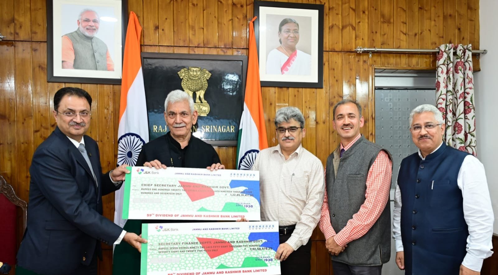 Srinagar, September 06,2025: J&K Bank has initiated the payment of dividend to its shareholders with Managing Director and CEO, Shri Amitava Chatterjee, presenting two dividend cheques of Rs 122.85 Crore and Rs 7.92 Crore to Lieutenant Governor Shri Manoj Sinha at the Raj Bhawan. The Union Territory Administration of Jammu and Kashmir, as the Bank’s promoter and majority shareholder, received the dividend for the Financial Year 2024-25.