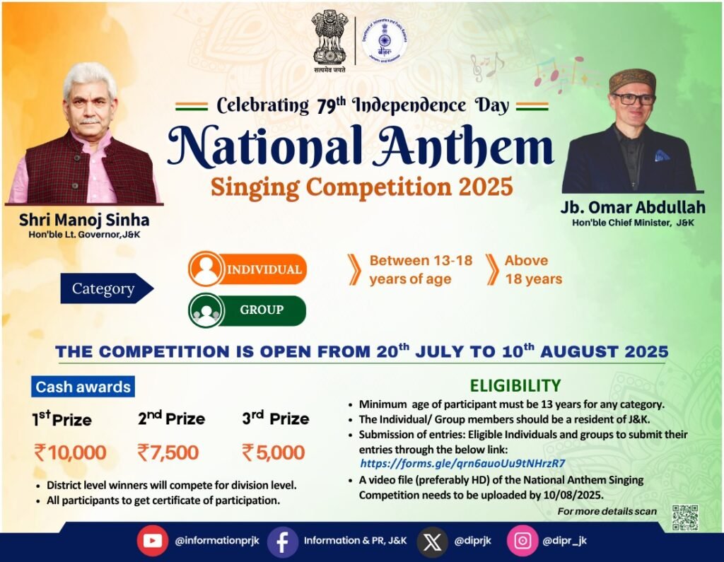 J&K’s 2025 National Anthem competition for Independence Day Kashmir Division July 20, 2025 Srinagar, July 21, 2025 – The Department of Information and Public Relations (DIPR), Jammu and Kashmir, has launched the National Anthem…